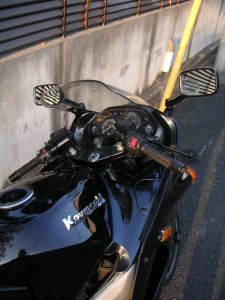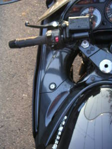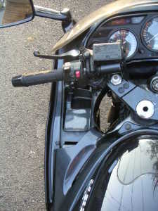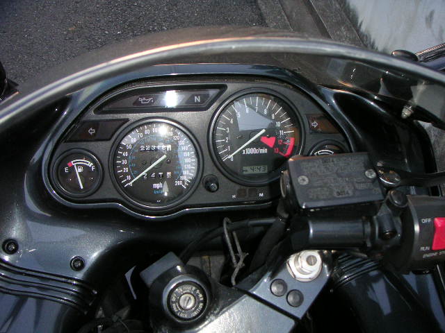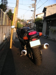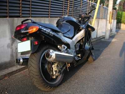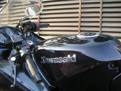 (右側面) 購入後2年目に、すり抜け時に転倒した際ついた傷がカウル右側面に残っている。ウィンカー近くのカウルも割れたのだが、ショップの人にうまくつけてもらった。 傷がついた時はショックだったが、今となっては愛着さえある。 180cm、75kgの私には、丁度良いポジション。 両足べったりつき、大柄な車体の割りに足つき性は良好。 ハンドルまでの距離も遠からず、近からず。 GPZ1100に乗っているTに言わせると、GPZよりも意外とポジションはコンパクト、との事。 |