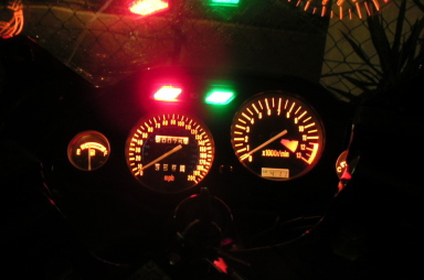 (夜間のメーター) 薄いオレンジ色で統一されたメーターは見易い。 が、もう少し色気があっても良いのでは? |