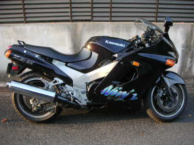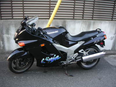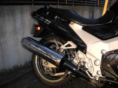 (左側面) フルノーマルのZX-11、95年式US仕様(D3)。 色はPearl Purplish Black Mica、紫がかった黒色をしている。 スクリーンもマフラーもすべてノーマル。ステッカーさえ貼っていないド・ノーマルのZX-11も珍しいのでは? ちなみに、この写真はセンタースタンドを掛けた状態だが、私は一人でセンタースタンドを掛ける事ができない。 後ろから一人サポートについてもらい、タンデムバーを引いて貰ってようやく270kg近い車重のこのバイクのセンタースタンドを掛ける事ができる。 (ちなみに、昔乗っていたZZ−R400も車重は200kg以上あったが、余裕で一人でセンタースタンドを掛ける事ができた) |