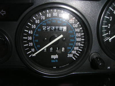 (スピードメーター) US仕様なので、マイル表示になっている。 内側に青い文字でkm/h表示があるが、運転中は文字が小さくて見れない。 マイルは1.6倍しなければいけないので、慣れるまでは大変。50マイルで80km/h、60マイルで約100km/hと感覚的に覚えた。80〜90が高速道路を走っていて一番楽なスピード域。 100を超えるとかなり身構えてしまう。 110〜もアクセルを開ければどこまでも簡単に加速していくのだが、自分の能力的にストップを掛けてしまう。 オドメーターもマイル表示。1.6倍なので現在の走行距離は3万5千km程。 メーター下側にはトリップメーターがある。 |