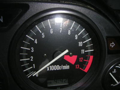 (タコメーター) 13000回転まで刻まれたタコメーター。レッドゾーンは11500回転から。普段の町乗りでは6000回転前後を使えば充分すぎるくらいに交通をリードできる。 ワインディングでは6000〜8000回転が一番トルク感がありレスポンスが良い。 メーター下部にはデジタル時計。 D3型まではここにもトリップメーターがついていて、それがとても好評だったのに、なぜデジタルメーターに変えたのか?ZZ−R400の時はツイントリップメーターだったが、あれは非常に便利。 但し、このデジタル時計は非常に精度は高く、7年近く使っていてバッテリーを外した時以外修正した事がない。 私が持っている腕時計(カシオのMr.G)よりも正確。 |