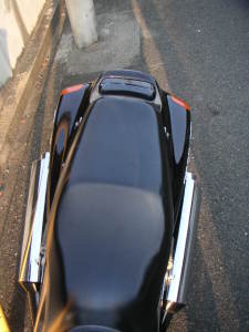 (シート後端) タンデムシートの座り心地は良好。タンデムステップとタンデムバーの位置も良く、レプリカのバイクに比べれば乗り心地は良いはず。 但し、シートは全体的に前方に傾斜しているので、自然と前方ライダーと密着する体勢になってしまう。 女の子とタンデムをするのならば最高であるが、男とはあまりタンデムはしたくない。 |
