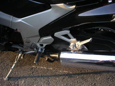 (マフラー) ノーマルのマフラー。こけた時に傷モノにしてしまった。 太くてピカピカしていて特に気に入っている部分。 音量はもちろんノーマルなので大きくはないが、音質は大型バイクらしい低音が効いていて心地良い。エキパイは鉄製。この部分だけは社外品の軽いものに交換したいところだが・・・。泥よけには反射板がついている。 |