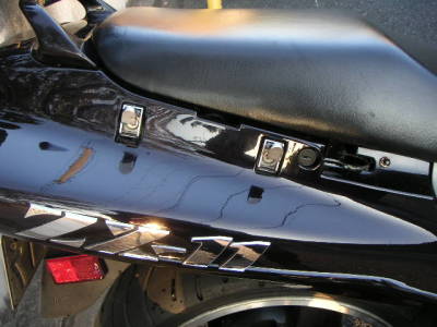 (ZX−11エンブレムとバンジーフック) タンクと同じくメッキ調のZX−11エンブレム。 高級感があって好き。バンジーフックはカワサキお得意の収納式。 本当はもう少しフックが深ければ良いのだが、それでもかなり大きなバックもしっかり固定する事ができる。写真はバンジーフックを上げた状態。 |