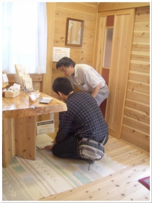 (左:オカ所長に板倉の実物大模型を見せて貰う。 右:リビングで板倉の説明。天井はムクの杉の梁。)