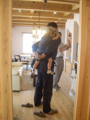 リビングで板倉の家紹介ビデオを見せて貰う。息子は女性スタッフからアメとハイチュウを貰ってとてもご機嫌。