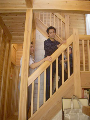 普段はオカ所長のご自宅なのだが、丹陽社の板倉の家のモデルハウスとしても建てられている為、随所に実験的な試みをしていたのが印象的。例えば、階段では敢えて無塗装のままの箇所と、一般的な塗料を塗った箇所を設けていた。経年変化をこれから何年も掛けて比較しようとの事。また、台所の床は水廻りという事もあってムクのフローリングではなく普通のフローリング材を使ってみたそうだ。足の肌触りはやっぱりムクの板の方がずっと良かった。