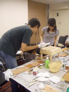 最初に所長から伝統工法の家の耐震性に関する説明があった後、実際にオスモカラーやリボスといった塗料を使って、説明を聞きながら実際に木片を使って塗ってみる。昔ながらの柿渋も準備されていた。柿渋は匂いが結構きつかった。 |