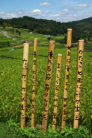 父が通っている明日香村棚田に父の案山子を設置する為、父と息子の3人車で奈良県明日香村に行く。その父の案山子は下の写真のもの。最初観た時にはこの竹が案山子の骨組みなのかと思った。まさかこれが案山子だとは・・・。父曰く「書の案山子なのだとか」。ここにはアマチュアカメラマンが多数案山子を撮影するのだが、案の定9割方のカメラマンは父の案山子は素通り。1割の感性の豊かな(?)もしくはちょっと変わった人が写真を撮っていってくれる。下の写真はそんな一人、Raukeさんが撮影した写真。父もこの写真をとても気にいっていた。Raukeさんは他にも多数素晴らしい写真を撮られている。オリジナルを観たい方はRaukeさんのHPでどうぞ。
