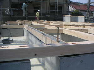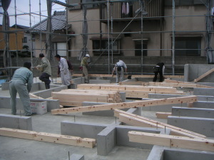 昼前に土台敷設作業が終了。一本一本アンカーボルトの位置を確認してドリルで穴を開けてボルト締めしていく為、結構時間が掛かった。本当に3日間で棟上げができるのだろうか、ちょっと心配。