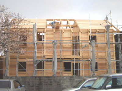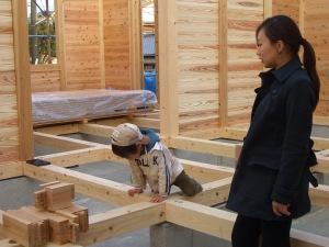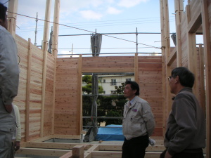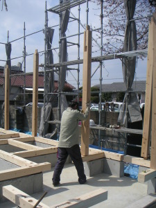 去年の10月に丹陽社に家造りを依頼して、一番心配していたのが施工面。設計事務所だけに設計までは間違いないとは思っていたが、実際に作業をしているところを観れなかった事を正直ずっと心配していた。当初予定していた大工工務店と丹陽社が折り合いがつかず、施工業者が今まで聞いていなかったYG工務店に決まった時も不安だった。でも今回の建方を観て安心した。まだ施工も序盤だけれどこれだけきっちり・明るく仕事をして、役者も揃っているYG工務店に決まって逆に良かったのではないかなあ、とさえ今回感じた。