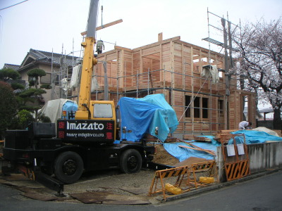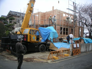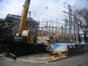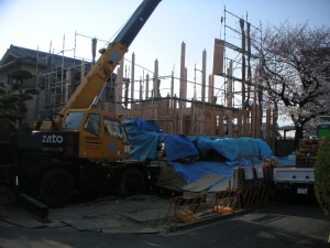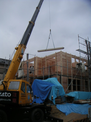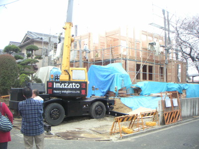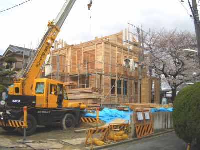 9時過ぎに到着したら、応援の2名の大工が現場で談笑していた。「こんにちわ、宜しくお願いします」と声を掛けると「立派な家ができますよ!」と答えてくれた。間もなく土台の檜を載せた2tトラックが到着。いよいよ作業開始だ。 大型クレーンで木材を敷地に移す。荷物を降ろしたトラックはすぐにまた南港に引き返していく。家の敷地には前日に仮設足場が組まれている。 |