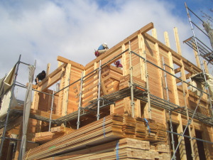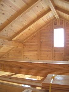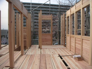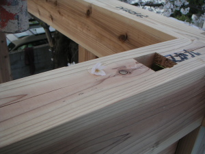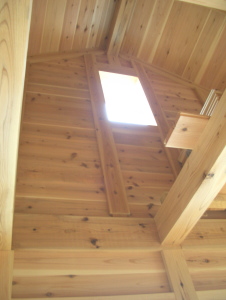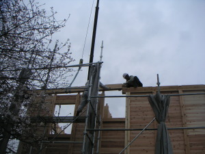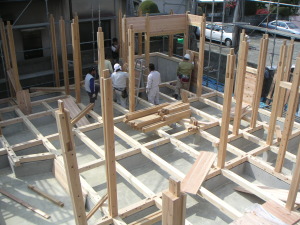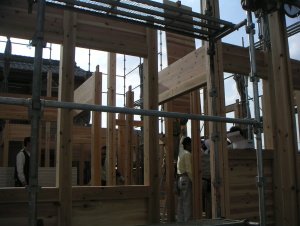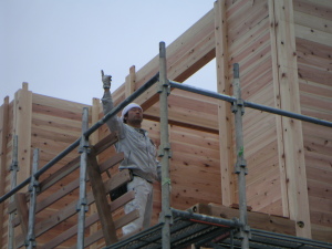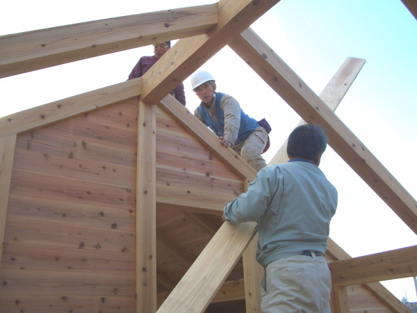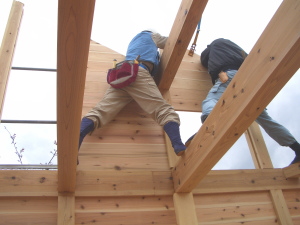 この作業はある面では板倉の家の特徴とプレカットの精度を良く現していると思う。1cm異なっただけで材が入らない。基本的には木組みとボルトナットで構造材を固定しているので、一旦組んでしまってもまたばらす事ができる。この作業を観て逆に私は精度の高さを実感して嬉しかった。
