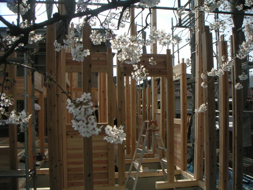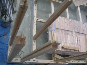 足場に登らせて貰って上から写真を撮ってみた。柱に溝が彫ってある。ここに厚さ3cmの板倉板を落とし込んでいく。 |