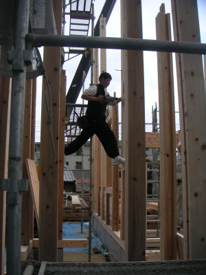 徳島H大工。観ていてこちらはハラハラするが、大工さんは皆普通の人には真似できない作業を平然とこなす。その姿は純粋に格好良い! | |