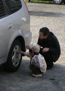作業はいつまで眺めていてもあきない。午後からはHさんとUさんも現場到着。少々退屈気味だった息子は大喜び。天気良く猫も作業を眺めていた(?)