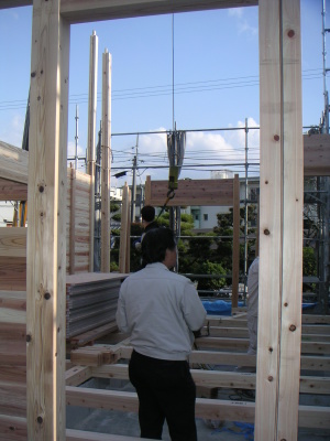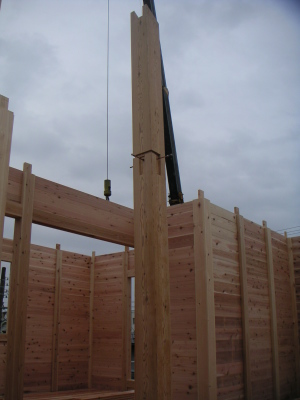 11時前、いよいよ大黒柱の搬入。この大黒柱はオカ所長発案で8寸角。1階からの通し柱ではないが、2階の主要部分と屋根を支える重要な柱だ。他の柱と比べても明らかにボリューム感が違う。 | |