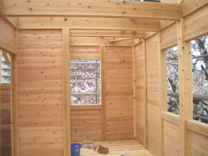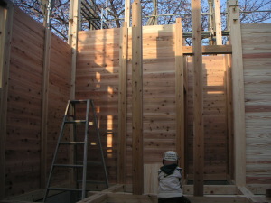 2階はまだ壁も半分くらいしか出来ていない。それでもおぼろげながら全体の輪郭は出てきた。この部屋は何も塗らず板倉壁をそのまま出す予定。 | |