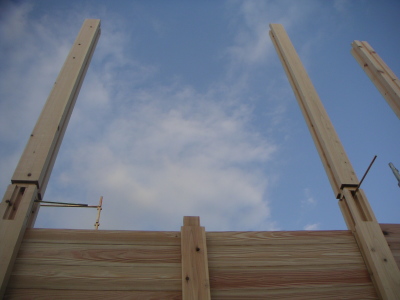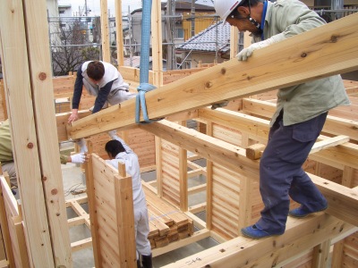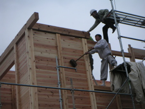 板倉の家の上棟は普通の在来工法の家と異なって壁を落し込みながら作業を進めていく。なので普通の在来工法と比べると棟上げも時間が掛かる。 | |