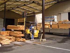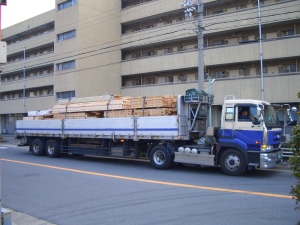 土台を敷く作業をしている間にも2tトラックは南港を往復。間もなく柱も到着。1週間前徳島で観た時は製材しただけの状態だったが、ちゃんとプレカット加工されて到着。 | |