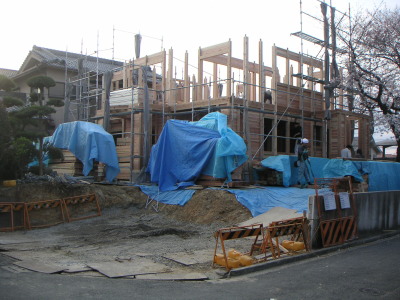 (夕方作業終了時点の状況。2階梁まで掛けられて状態)