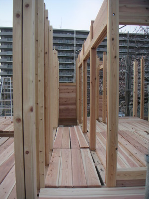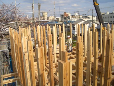 上の写真は今回の棟上げ写真の中でのベストショットだと思う。オカ所長はこの写真をブログ掲載して「家は小さな森になる」とコメントしたが、この写真を観るとまさにそう思う。ちなみに嫁さんはこの写真を観て「家が柱だらけで本当に住めるの?」と真剣に心配していた。