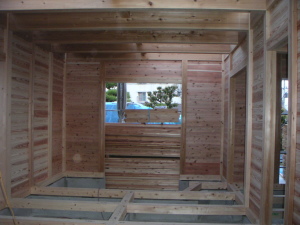 1階の部屋の様子。2階の床を仮置きした事で1階は昨日よりも部屋らしくなってきた。 |