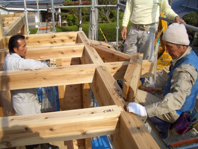 ちょっとしたトラブル発生。かなり長めの梁が一本どうしてもうまく入らない。大工2名が梁の両側に散って上から叩くのに併せて横から押し込む方向に叩いてサポートするのだが、どうしても入らない。 | |