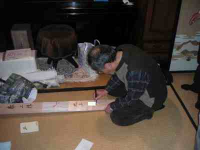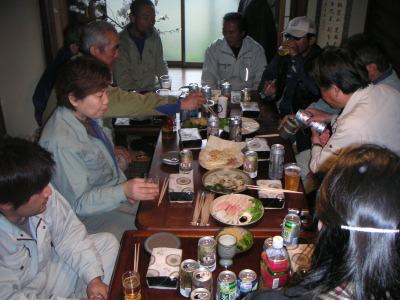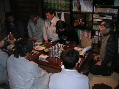 慌てて注文していた弁当を取りにいき、座をセッティングして2時半過ぎ丹陽社スタッフ・大工さん・電気屋さん・レッカー屋さんに来て貰う。当初晴れれば桜の下でやる予定だったが、雨の為実家で行う事になった。 | |