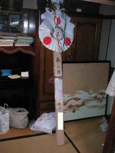 YG工務店が随分立派な棟上げ用の飾り(名前があったが忘れてしまった)を用意してくれていた。そこに父が筆で施主名と日付を書き込む。 | |