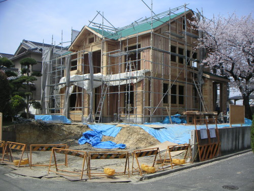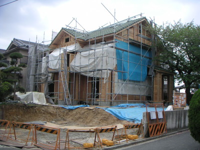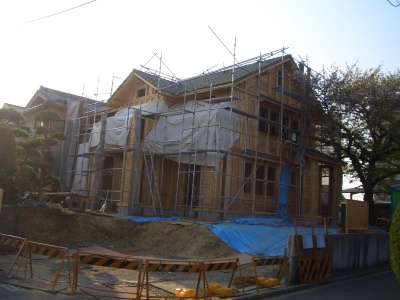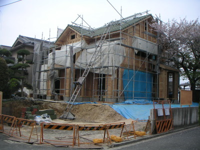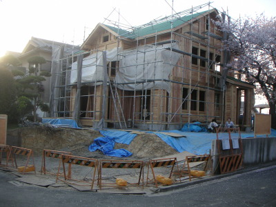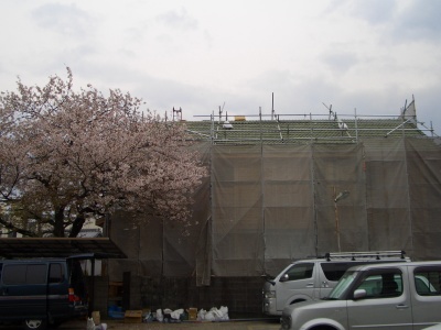 4月に入り年度明け、私の会社でも人の動きがあった。私、幸い家の完成前の異動という最悪の事態は避けられた。折角ここまできたのだから暫くは完成した家でゆっくり住みたい・・・。さて会社のバタバタがあった為棟上げからのこの1週間はかなりはハードスケジュールだった。先月までは少々遅くなっても会社帰りに途中下車し現場に寄って、作業進捗を確認していたのだが、今週はそれもする余裕が無かった。あの雨の中の迫真の作業から1週間、すっかり屋根ができて防水シートまで敷かれて家らしくなった。