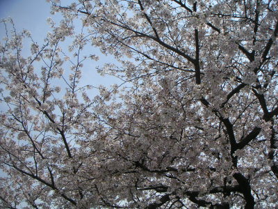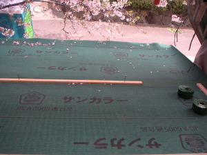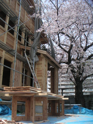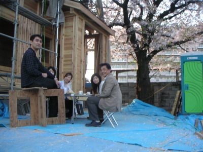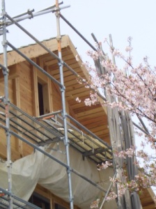 快晴の天気、1時過ぎきっかりに二人の大工さんが作業を開始。棟上げの時と違って動きは少ないが釘をうつ機械の音や木を降ろす音が、なんとなく心地良い。この後母と息子と3人で長居公園に行き、オカ所長が会長を務めているNPO団体主催の「野外能鑑賞」を観に行った。満開の桜が咲き乱れる下で初めて観る能は、”難しい”印象が9割、でも1割は衣装のきらびやかさ、役者の動きの繊細さが印象深かった。