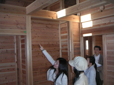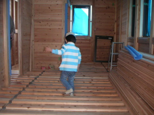 今まで仮設足場から大人が二階に上がるのを観ていて一緒に行きたいのをずっと我慢してきた。ようやく二階を一通り見学する事が出来て満足そうだった。見学し終わった後何故か(感謝を込めている?)玄関で一礼。後から聞いたらYG工務店Y社長の真似なのだそうだ。 |