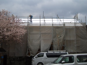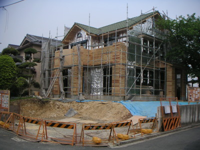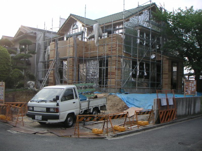 ある程度形ができてしまってからは、1週間程度経っても外観上の大きな変更は判らない。銀色に見える箇所は遮熱シート。この上に再度バラ板を貼って空気層を確保するそうだ。