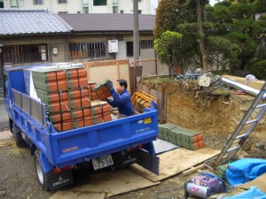 瓦もトラックに載せられて到着。瓦は愛知三州瓦で”東洋瓦”というメーカーのものを採用。 |