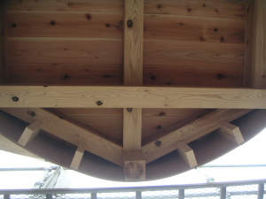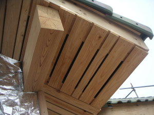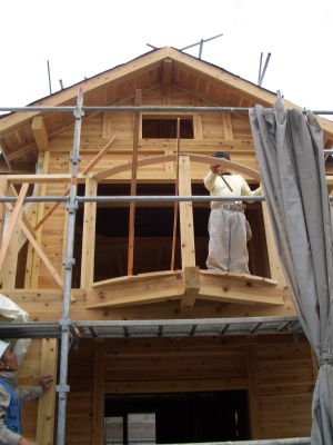 軒下の処理。当初予定通りモルタルで塗るか、木を見せるかオカ所長は迷っていた。棟上げ後構造体を見る度に私もオカ所長も「極力余計な事をしたくない。さわりたくない」と思ってしまう。但し、全体のデザイン・ディティールとの兼ね合い、そして防火上の事等を総合的に判断する必要が出てくる。この辺の細かな事に関してはオカ所長にお任せしている。 | |