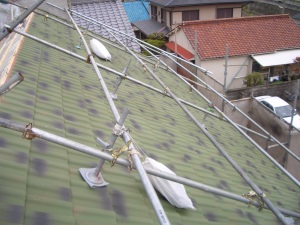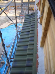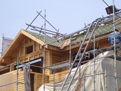 屋根の緑色の正体が左写真の防水シート。この防水シートの上に瓦を敷く。近くで観てみたが思っていたよりもしっかりしていた。この防水シート、偶然か屋根瓦の色と同じ緑色をしている。嫁さんは3日に息子と二人で観に来ているのだが、この防水シートが今度敷く屋根瓦だと思って「しまった、色は失敗した!」と思ったそうだ。確かに鮮やかな色だけれどこのままの色だったら安っぽいかな・・・。でも緑色の屋根は色あわせが難しそうなのは事実。 |