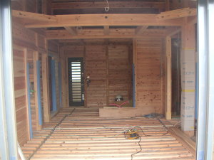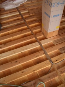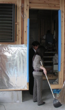 現場では所狭しと職人さん達が作業をしている。M棟梁、Y兄大工のお二人は1階の床を張ったり内装作業をしている。電気屋が配線工事、サッシ屋はサッシの調整をしていた。そんな中丹陽社のオカ所長、Hさんも来ていて明日の現場構造見学会の準備をしていた。 |