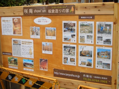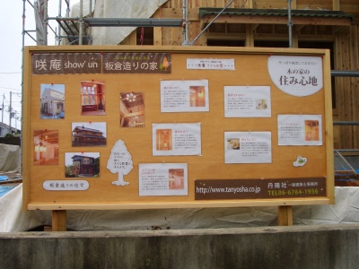現場に看板が設置された。実はオカ所長から「現場に看板を設置させて下さい」という話があったのは2週間前。現場工事に入ってから、道を行く人が結構立ち止まって工事の様子を眺める事があり、中には工事の概要を聞かれる事もあった。板倉の家は現場を観るのが一番良さが判ると思うので、看板は良いアピールになるはず。 早く宣伝になる看板を設置すれば良いのになあ、とずっと思ってきた(取り敢えず”板倉の家”と”丹陽社”だけでも挙げておけば最低限の宣伝にはなる)。 施主の私が気にする事ではないのだが「板倉の家」と「丹陽社」を応援している私としては、心情的についつい施主という立場を超えて相変わらず営業っ気の無い丹陽社にやきもきしてしまう。まあ、そこを気に入って丹陽社に家造りをお願いしたのだけれど(笑)。