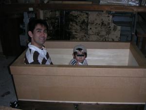 出荷前の高野槇のお風呂。頼み込んで中に入らせて貰った。外側は養生紙。内側の色が高野槇の木肌の色だ。ちなみに入り心地は上々。背もたれの位置や足を伸ばした時の長さも丁度良かった。 | |