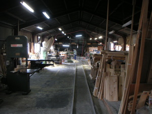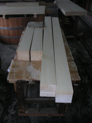 工場の内部。この工場ができた当時は高野槇のお風呂が量産できるようにと、真ん中にレールが敷かれたそうだ。量産どころか今は作る量極端に減ってしまったらしい。「工場」というよりは「工房」といった雰囲気で、高野槇独特の爽やかな香りがした。 | |