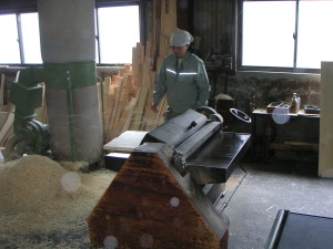 徳島でも静岡でも思ったが、職人さんが物を作っている姿というのは実に格好が良い。ここの作業工程では板の表面を削って滑らかにしているようだった。ここでの行程は削りかすがとても良い香りがしていて、袋詰めして貰って帰りたくなる程。 | |