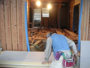 屋根工事と平行して軒裏や床に板を張っている。電気屋が入って配線工事も行っていた。