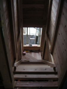 樋口製作所を後にして、一旦現場に戻る。現場到着した時には丁度M棟梁とY大工が一生懸命階段を設置しているところだった。