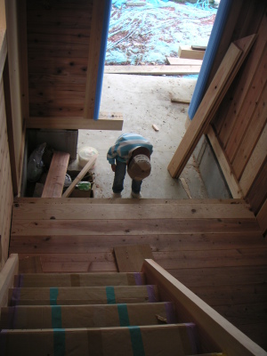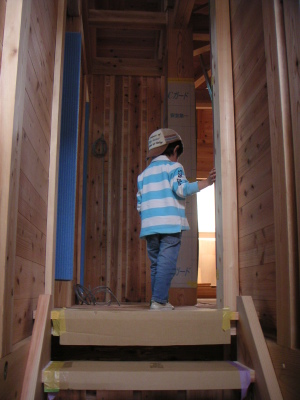 階段が出来た事を息子に話をしたら、「二階にあがれるね!」と目を輝かせた。階段の早期設置は息子の要望事項でもあった(第19回打合せ議事録にも記載されている)。次の日(20日)早速息子を連れて現場に行く。出来立ての階段を使って初めて二階に上がる。 | |