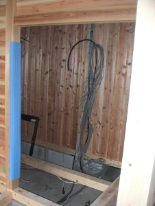 内装も着々と作業が進んでいる。「どうしてこんなに配線がいるの?」と疑問に思う位床中を配線が這い回っている。水廻り箇所には配管も設置されていた。ユニットバスは22日に搬入・設置済み。