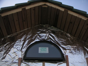 二階正面の軒下に半円窓のサッシが入った。周りの銀色のものが遮熱シート。 | |