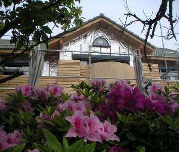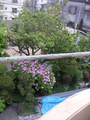 屋根工事が終ったので、仮設の一部が撤去されていた。また、階段が出来た事によって今まで二階への入り口だったバルコニーも作業を進める事ができるようになったようだ。そのバルコニーから庭を見下ろしてつつじが綺麗に咲いているのを見つけた。 ざくろ、さざんか、桜、そしてつつじと季節毎に何らかの植物の見頃がある。家の建設が始まり毎週末母屋に来るようになって初めてそれに気がついた。祖父が私に庭の話をした事はないが、これだけ季節毎の表情豊かな庭を残してくれた祖父に改めて感謝。 |