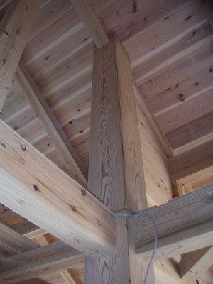大黒柱近辺。当初は飾りとしてだけ配置する予定だった大黒柱は、丹陽社オカ所長と中千木材C常務が相談して構造上も要として使える位置に配置して貰った。1階からの通し柱ではないが、2階の梁が四方から差し込まれ、屋根も一部支えている。実は家具の配置変更も、この大黒柱が構造上重要な要素として配置された事によって、ひときわ存在感が増した為に起こった。 | |