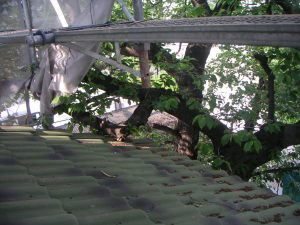 桜の木の枝が一部、屋根瓦に乗ってしまっている。YG工務店Y社長には「家にダメージでる場合には枝を切って貰って構いません」と話してはいた。ただ、桜は枝を切ると木に対するダメージが大きいそうで、しかも私も丹陽社も「桜、さくら・・・」と言うものだから、社長曰く「ここの枝を切る勇気が出ませんでした」との事。普段はこれでも良いが、台風等で木がしなった時に瓦に対しては悪影響は避けられなさそう。両親と相談して、私達の方でこの枝は切る事にした。「切って貰えるのですか」とホッとした表情のY社長。 |